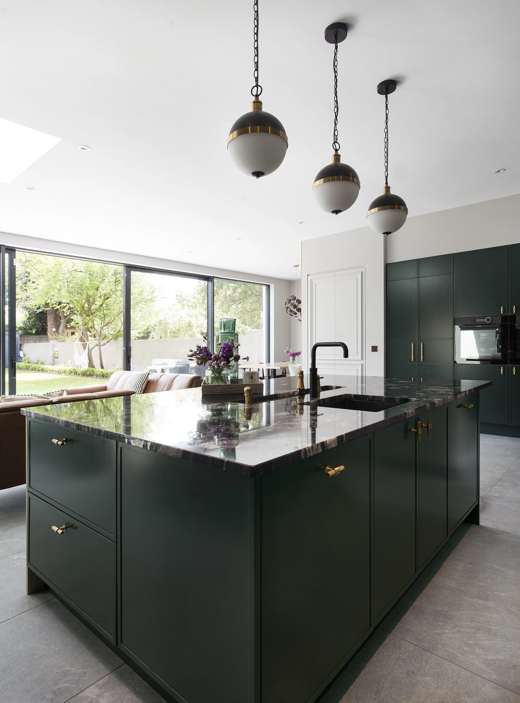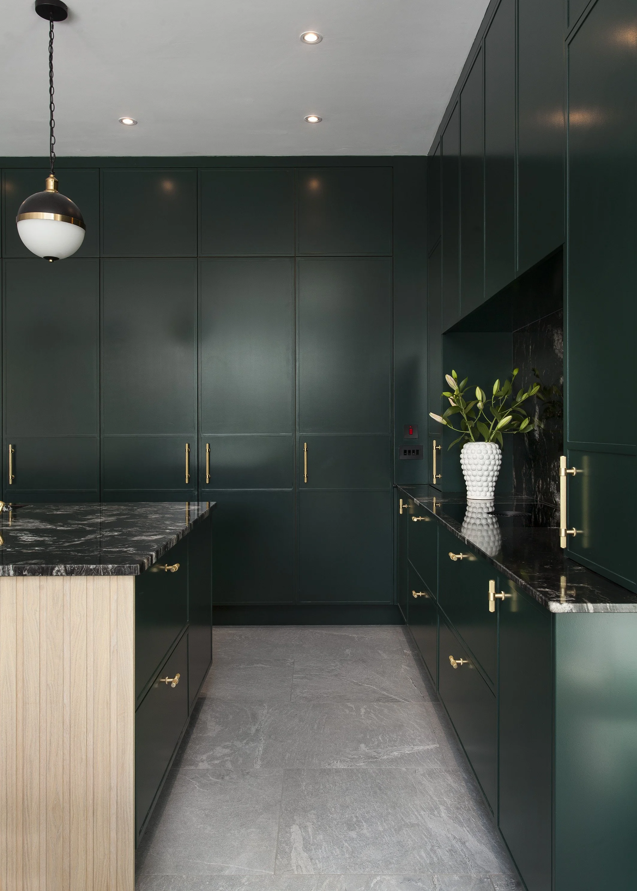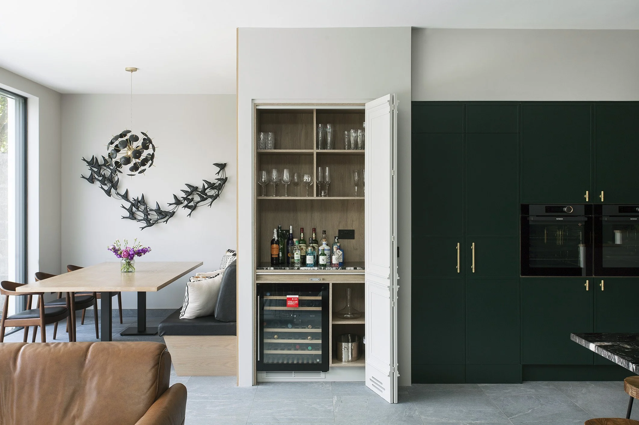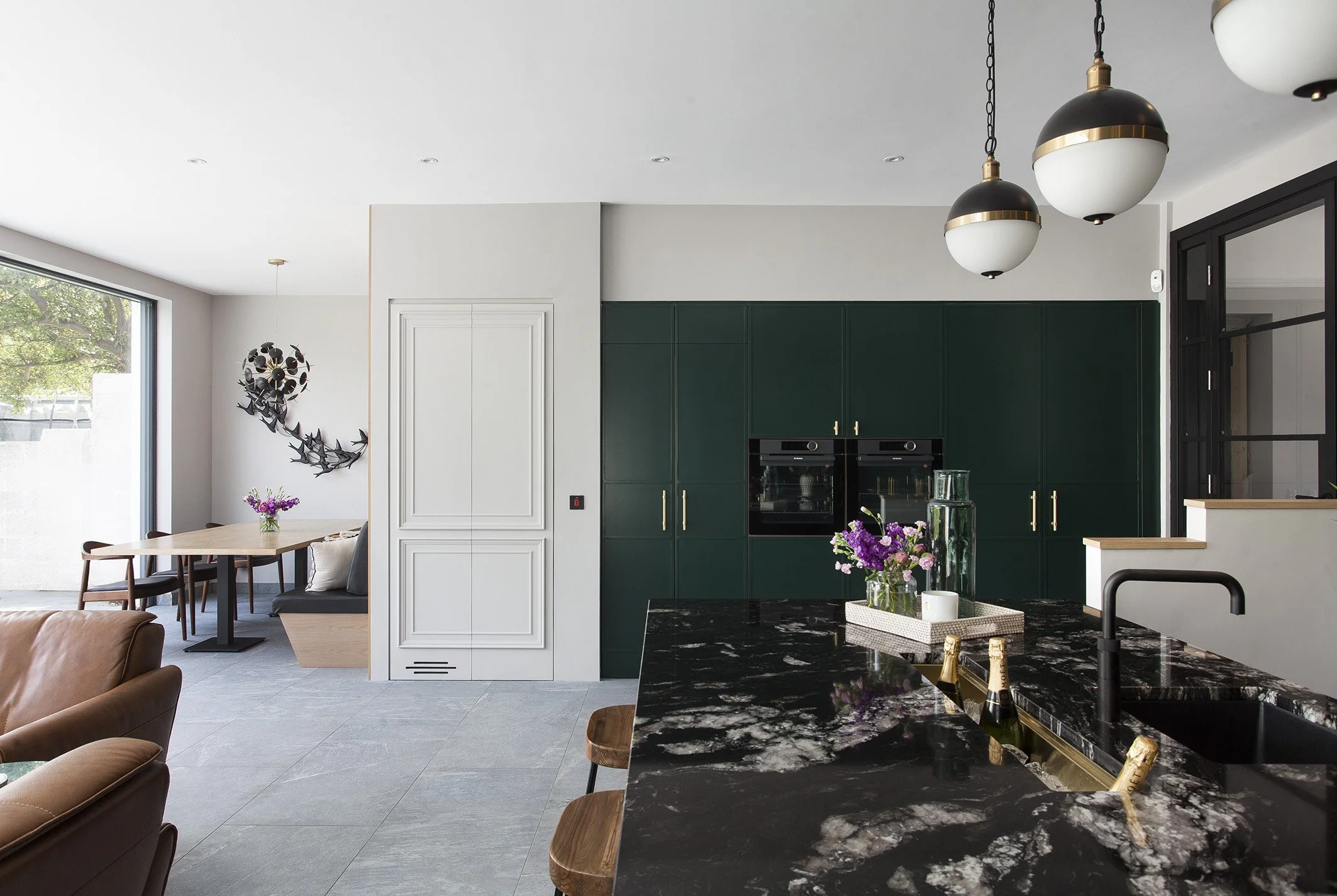 Slim micro Shaker doors in Zoffany Huntsman Green create a beautiful ambience in this renovated Art Deco home with exotic black marble surfaces and brass accents. The tall run of cabinetry is full 2.9m ceiling height with hidden pocket doors leading to the utility room, and to the left of the secret doors, panelled doors open with a bifolding mechanism to reveal a bespoke home bar. The custom-made dining area and media cabinet in the sitting area are finished with vertical slatted panelling, adding detail and contrast to the scheme. Complementing the period of the home, timber, custom-made Crittall style doors have been designed to link the entrance hall and kitchen.