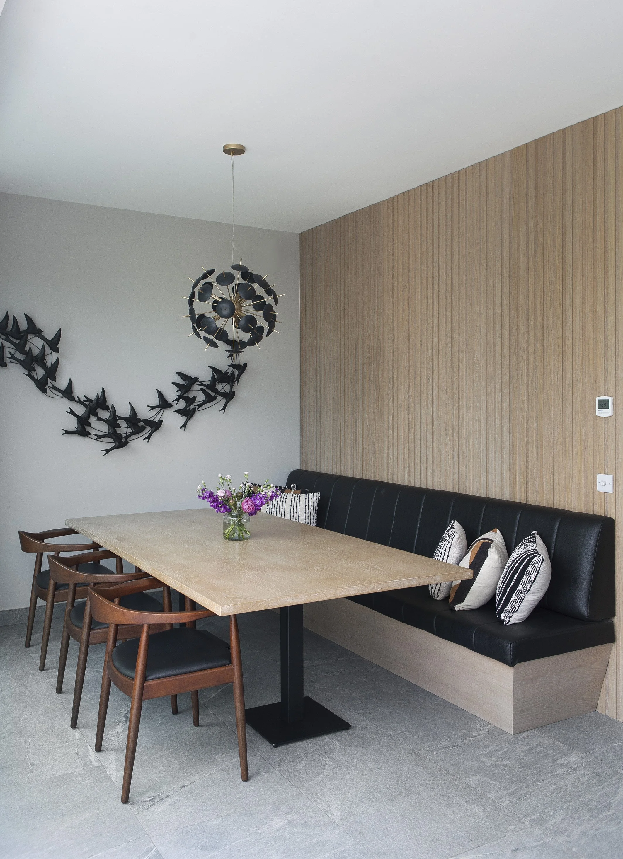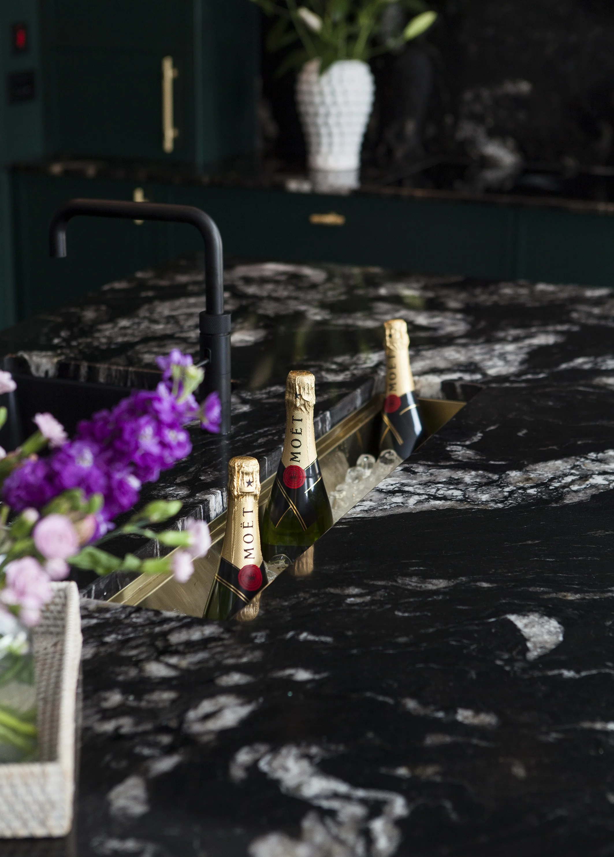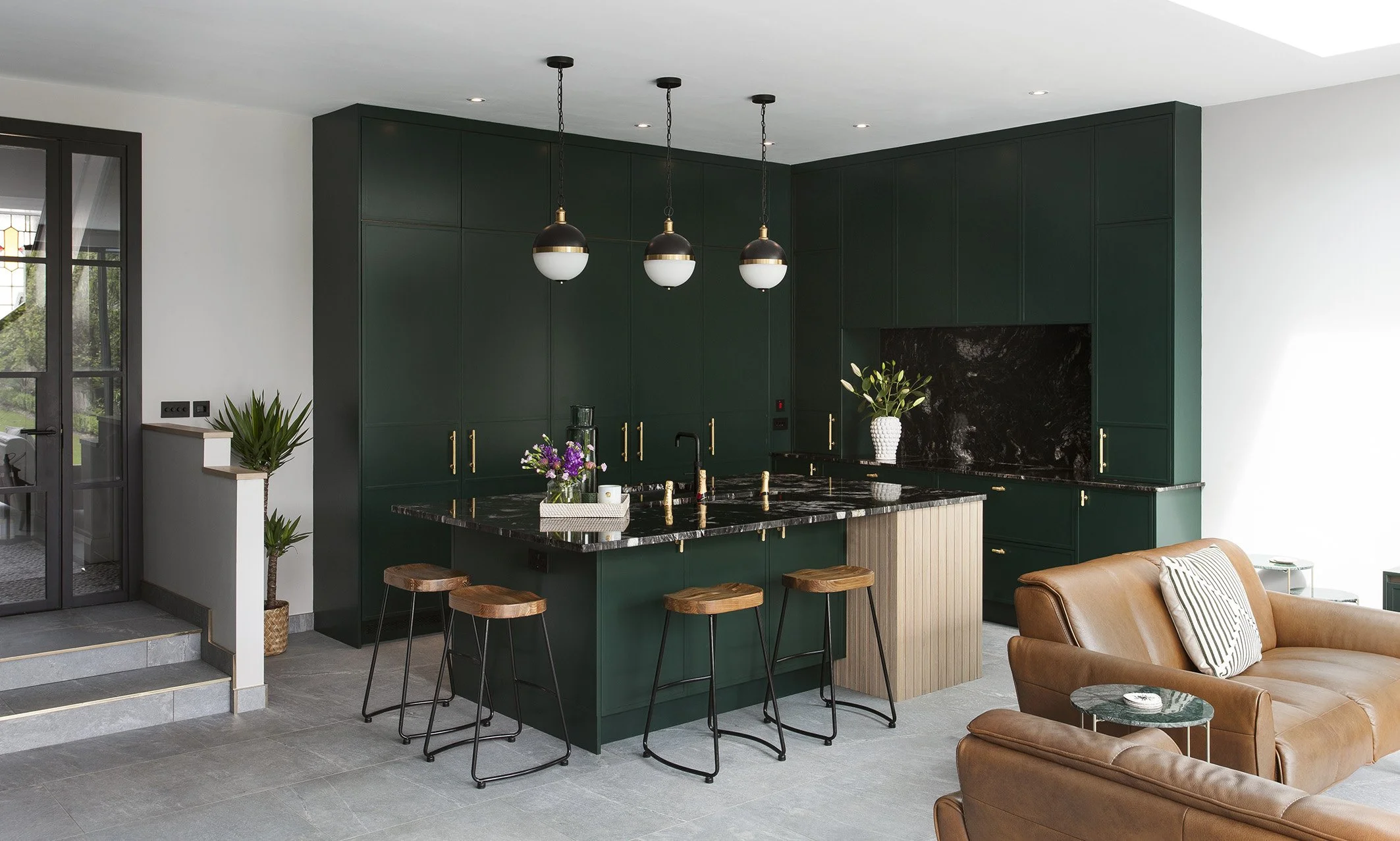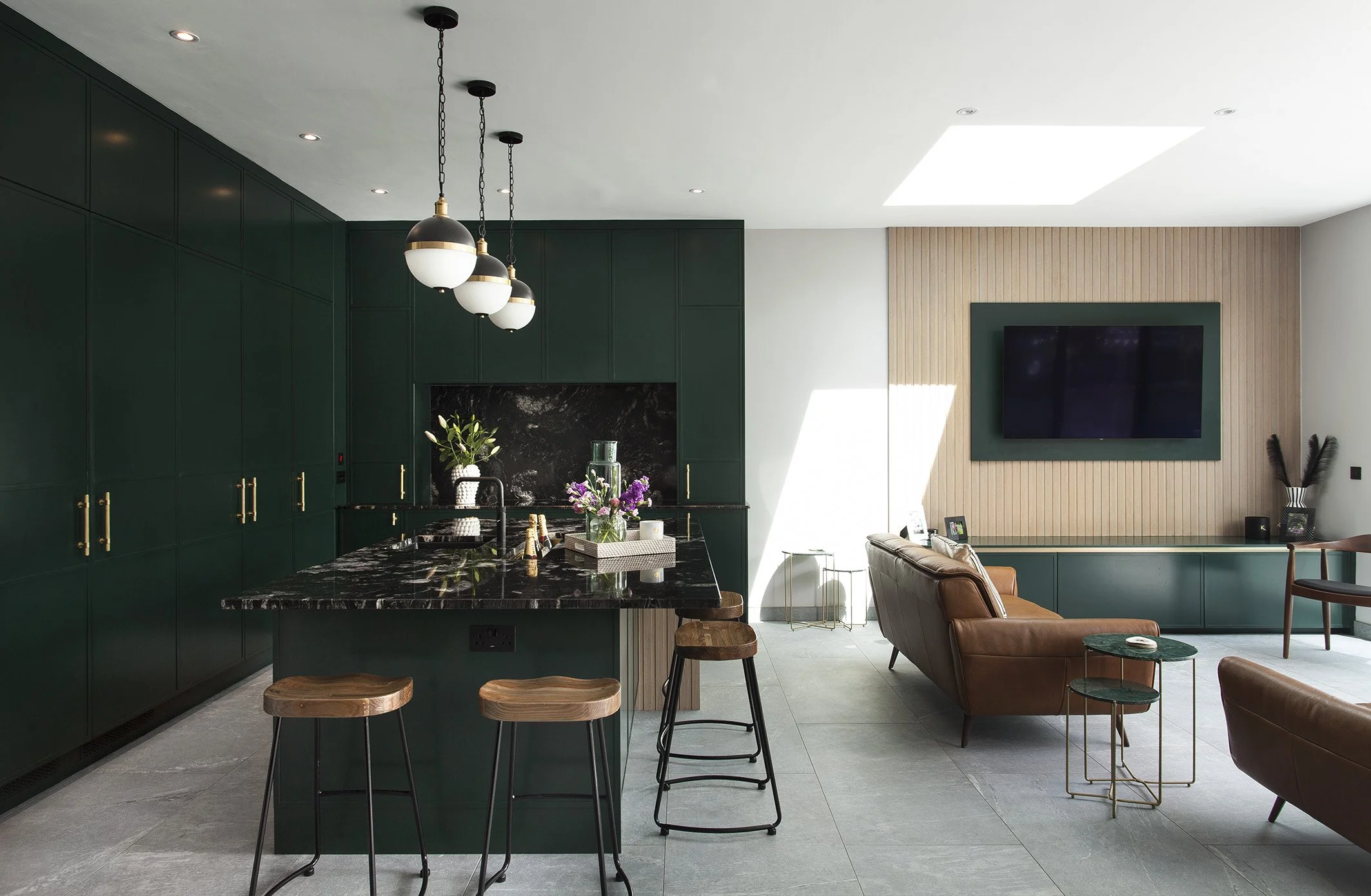 Slim micro Shaker doors in Zoffany Huntsman Green create a beautiful ambience in this renovated Art Deco home with exotic black marble surfaces and brass accents. The tall run of cabinetry is full 2.9m ceiling height with hidden pocket doors leading to the utility room, and to the left of the secret doors, panelled doors open with a bifolding mechanism to reveal a bespoke home bar. The custom-made dining area and media cabinet in the sitting area are finished with vertical slatted panelling, adding detail and contrast to the scheme. Complementing the period of the home, timber, custom-made Crittall style doors have been designed to link the entrance hall and kitchen.